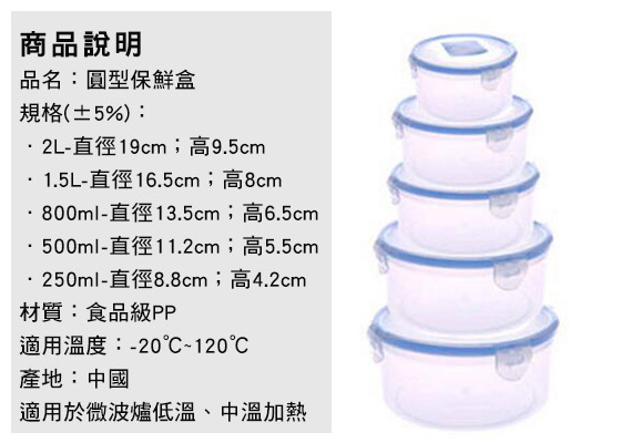 商品訊息簡述: 平均每組最低只要259元起(含運)即可享有圓型保鮮盒5入組1組/2組/4組/8組/20組/40組。